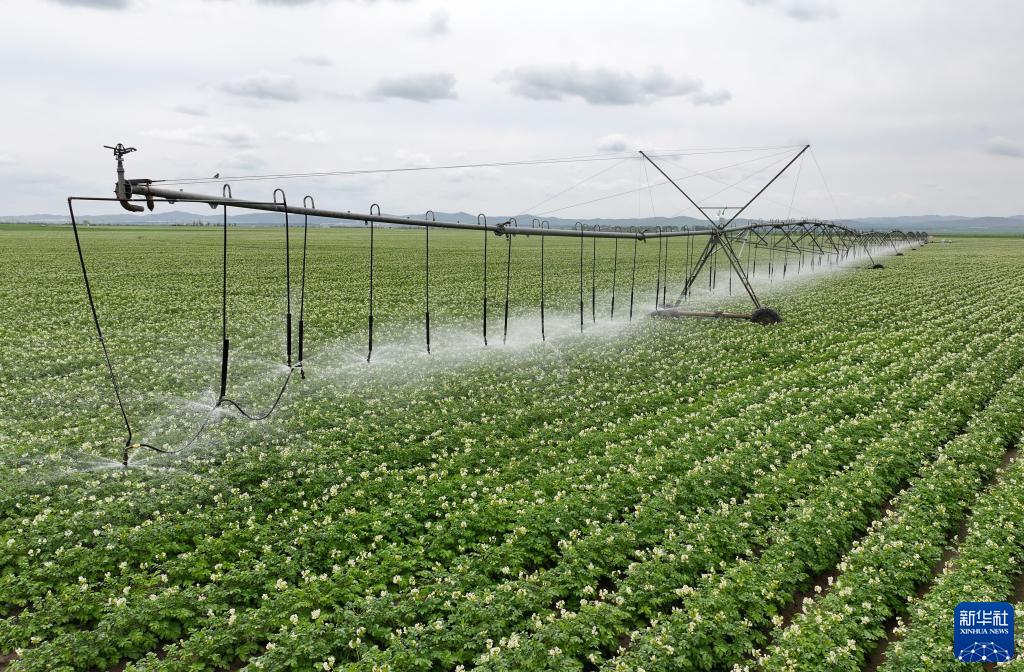 7月15日,張家口市塞北管理區的指針式噴灌設備在田間作業(yè)(無(wú)人機照片)。