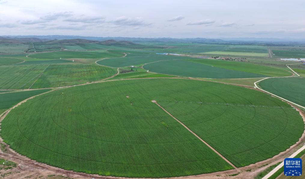 7月15日在張家口市塞北管理區拍攝的裝有指針式噴灌設備的農田(無(wú)人機照片)。