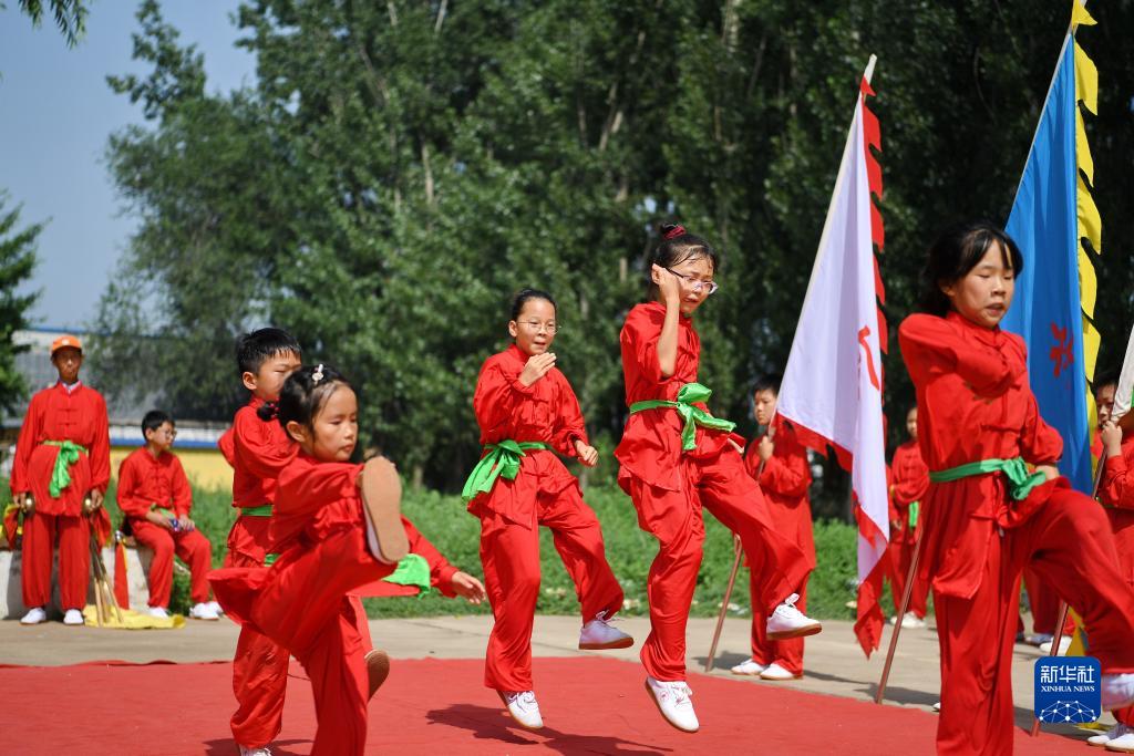 7月16日,學(xué)生在河北省涿州市刁窩鎮望海莊村練習傳統武術(shù)望海莊少林會(huì )。