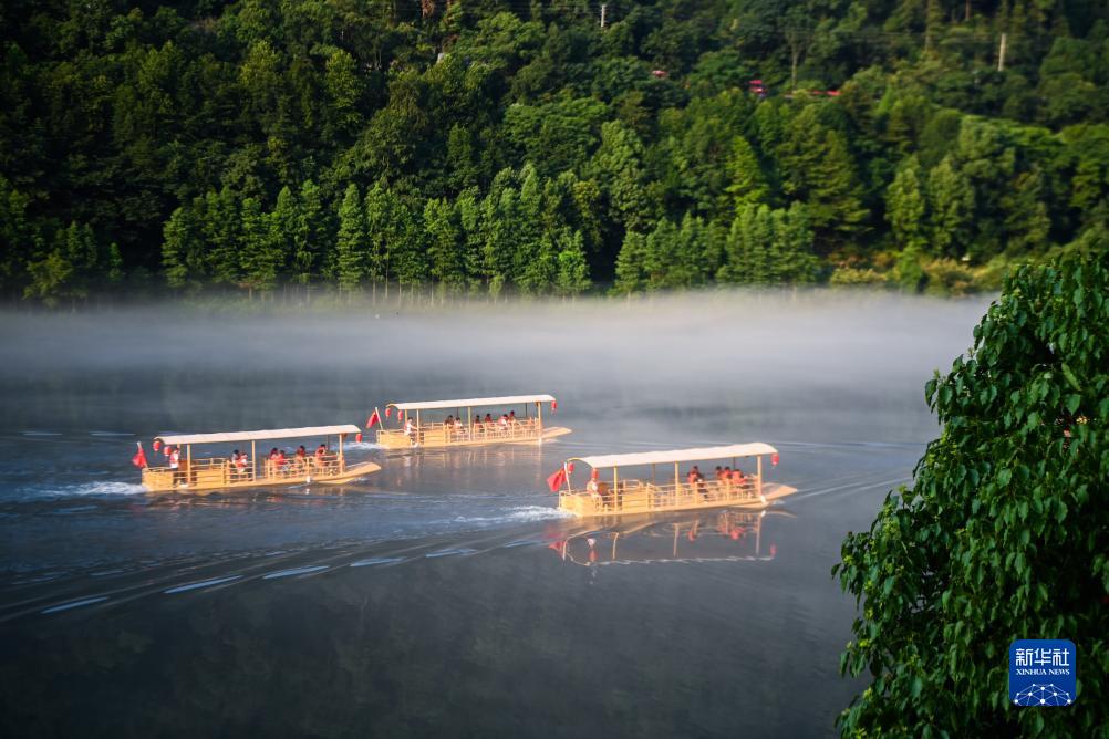 盛夏時(shí)節,浙江省建德市新安江景區推出特色清涼漂流,“竹筏”型游船視野更開(kāi)闊、親水性更佳。新安江水質(zhì)清澈,水溫常年在12-17℃,當江水與空氣溫差較大時(shí),便會(huì )在江面上形成一層霧氣。每年夏季的清晨和傍晚,清涼的新安江水和江上夢(mèng)幻奇霧吸引各地游客前來(lái)避暑度假。