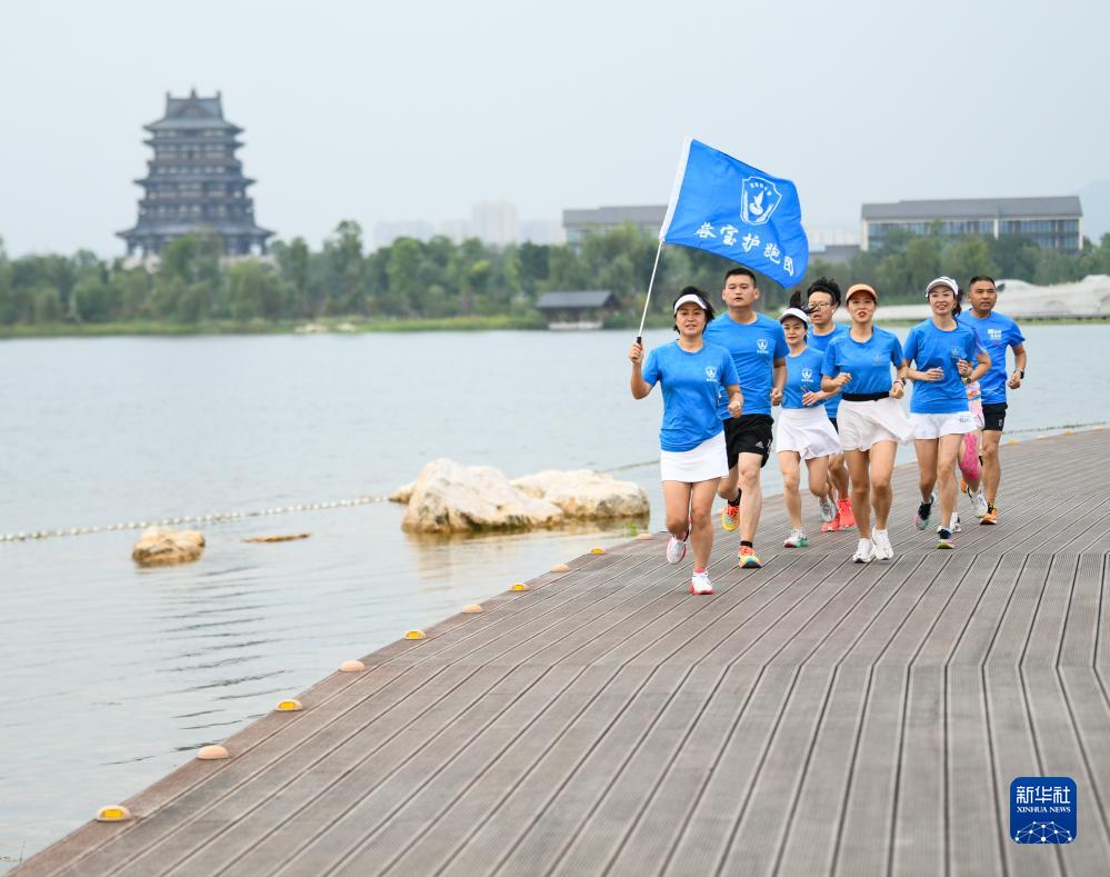 在成都市龍泉驛區東安湖體育公園,杜以萍(左一)帶領(lǐng)跑團成員跑步(7月12日攝)。