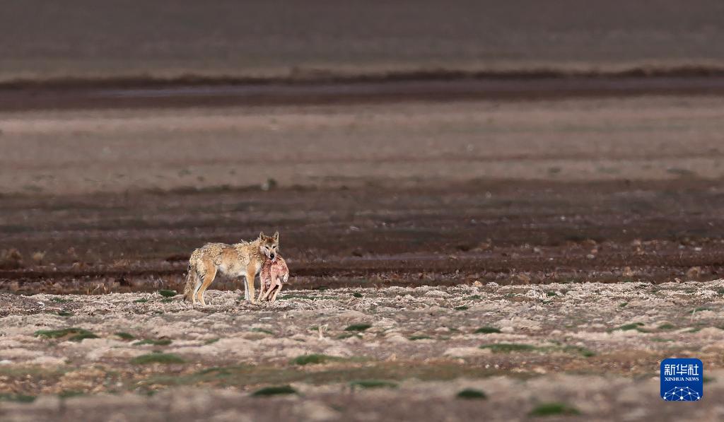7月10日,在新疆阿爾金山國家級自然保護區,一只狼叼著(zhù)剛捕獲的藏羚羊幼崽。