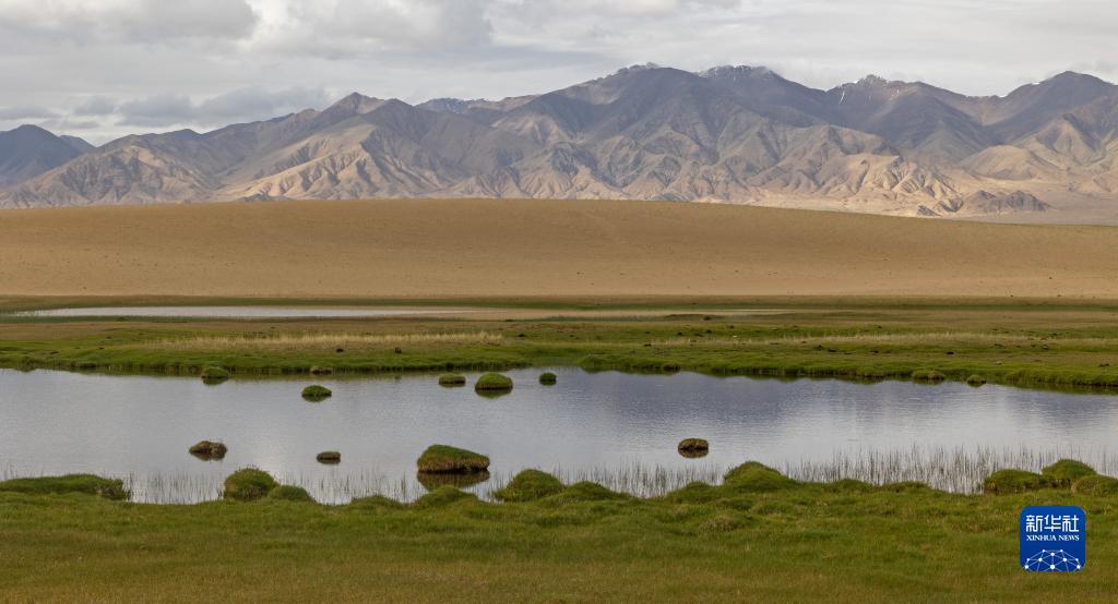 7月1日,在新疆阿爾金山國家自然保護區,庫木庫里沙漠旁的一處濕地水面倒映出天空。