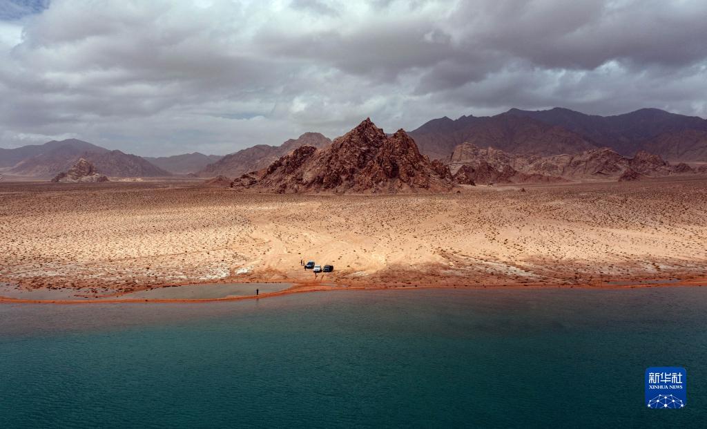 6月30日,在新疆阿爾金山國家自然保護區拍攝的阿雅克庫木湖旁的祁曼塔格山(無(wú)人機全景照片)。