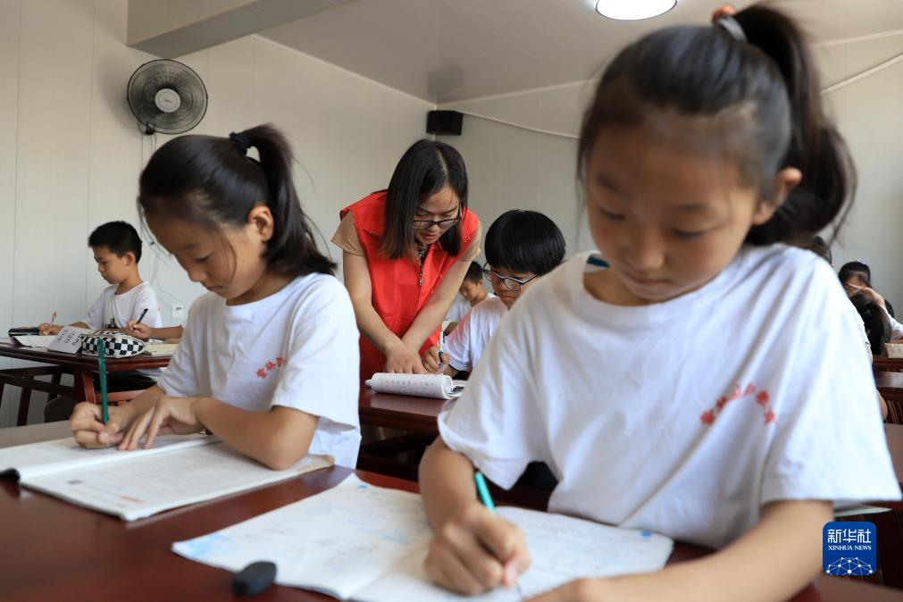 7月17日,在河北省滄州市孟村回族自治縣辛店鎮董林村國學(xué)館,志愿者為孩子們輔導暑期作業(yè)。