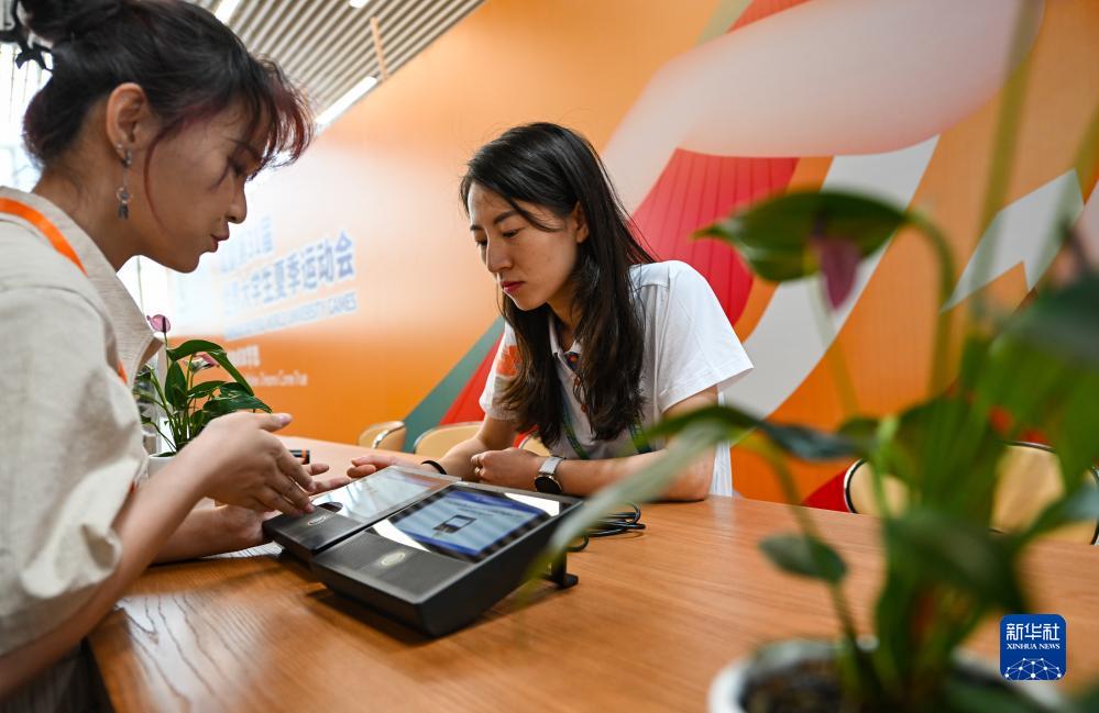 7月15日,在大運村歡迎中心服務(wù)臺,媒體記者正在體驗語(yǔ)言智能翻譯服務(wù)。