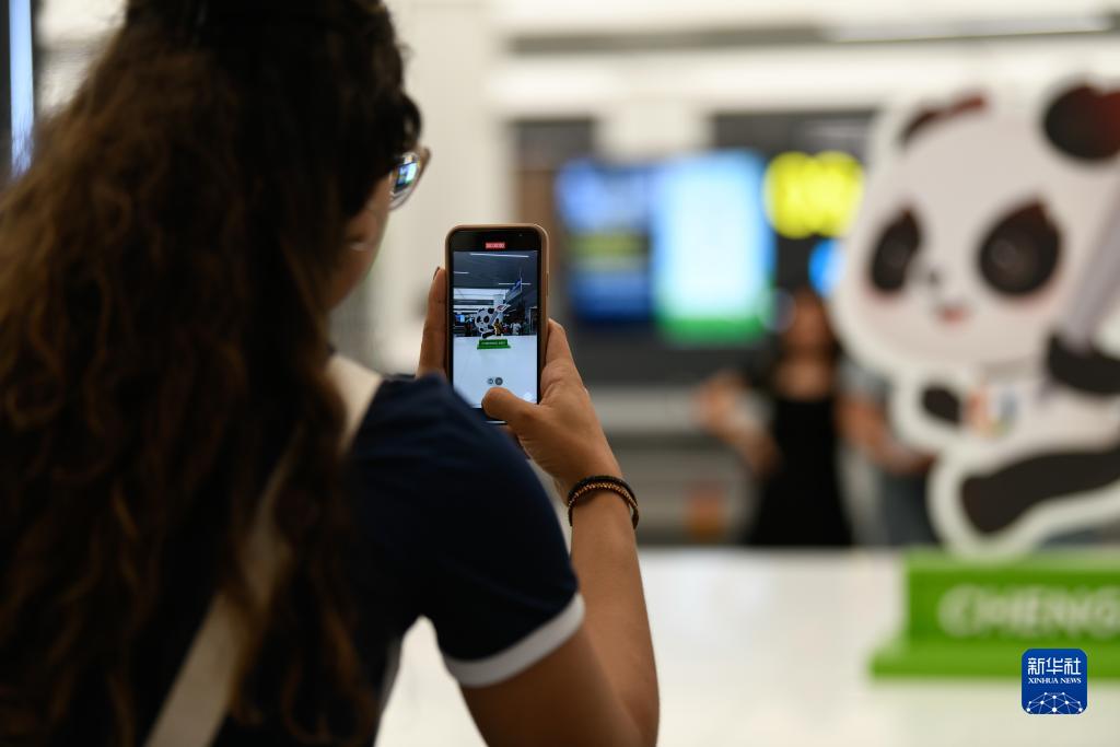 7月17日,在成都天府國際機場(chǎng),巴西代表團成員在等候行李時(shí)拍攝機場(chǎng)內的大運會(huì )吉祥物“蓉寶”裝飾。