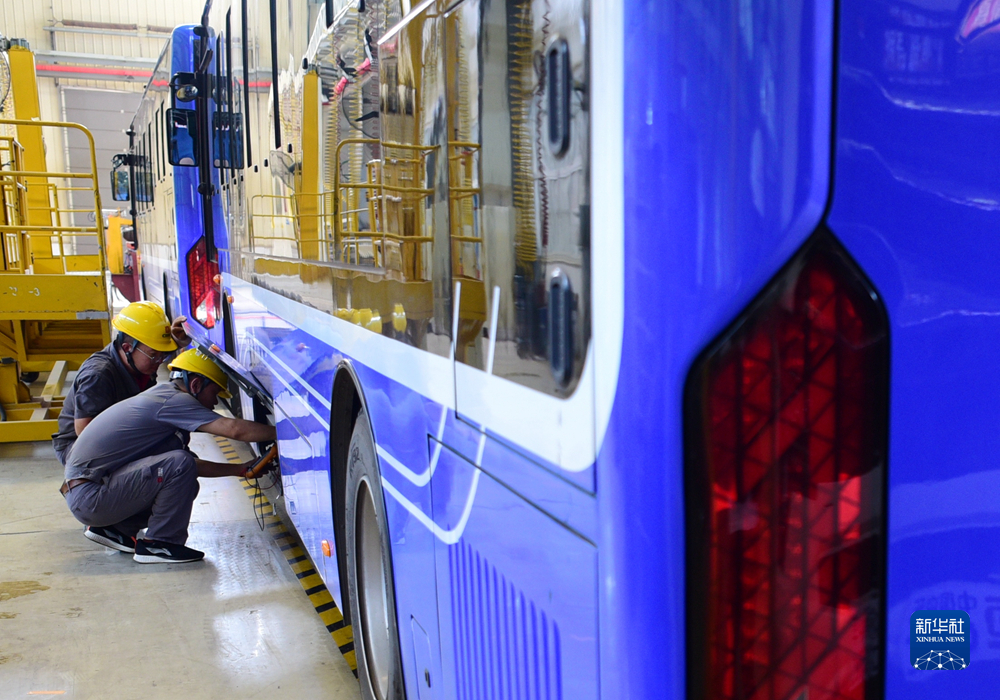 7月17日,在中車(chē)齊車(chē)集團石家莊公司生產(chǎn)車(chē)間,工人在檢測新能源汽車(chē)線(xiàn)路。