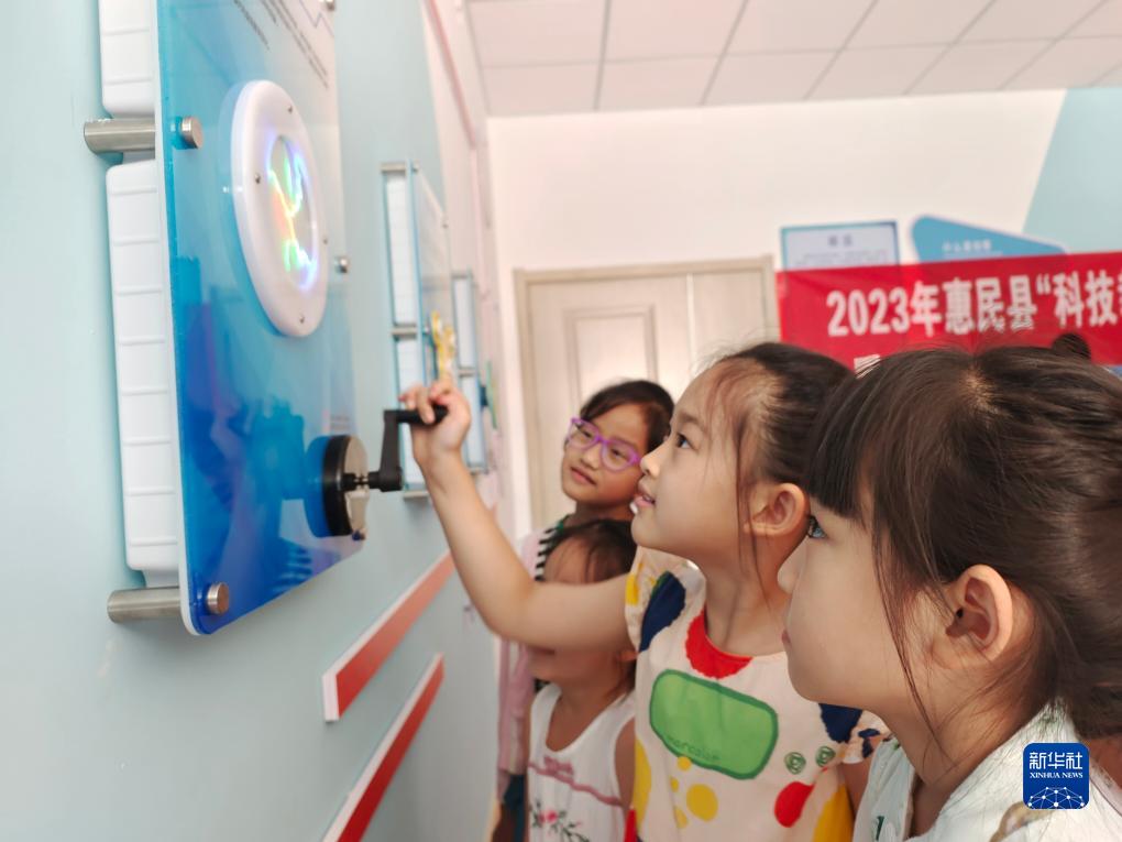 7月17日,在山東省濱州市惠民縣新時(shí)代文明實(shí)踐中心的科普知識屋,孩子們在體驗“光電盤(pán)”。