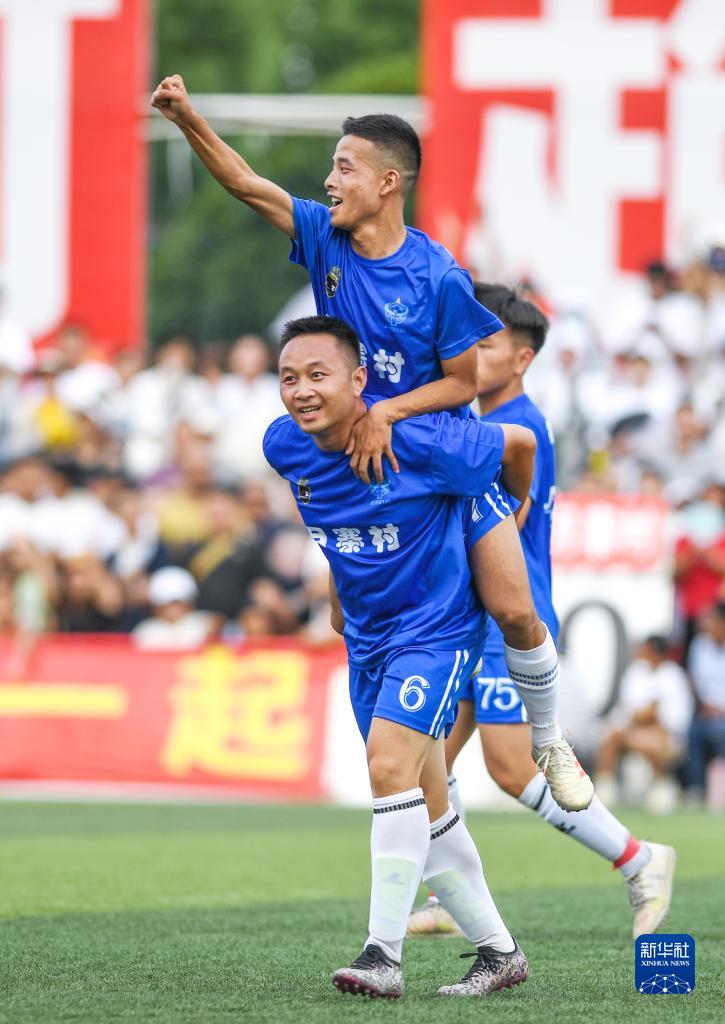 7月15日,月寨村足球隊球員李遠攀(前)與隊友在慶祝進(jìn)球。