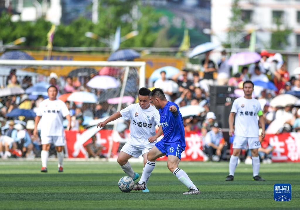 7月15日,六佰塘村足球隊球員楊宗維(前左)在與月寨村足球隊的比賽中拼搶。