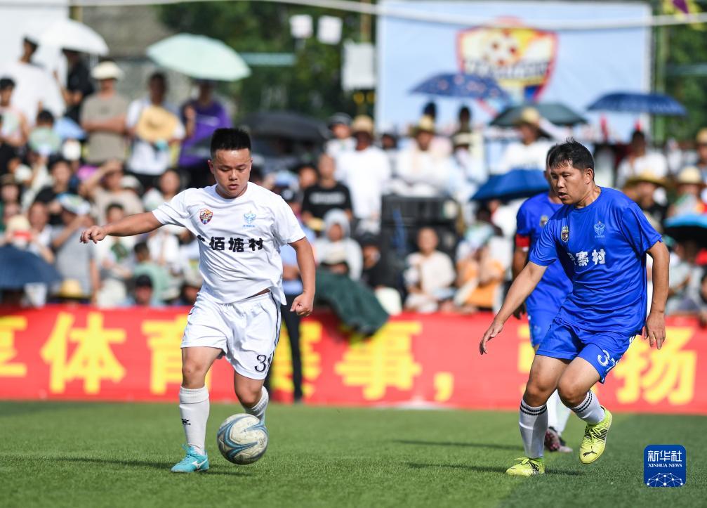 7月15日,六佰塘村足球隊球員楊宗維(左)在與月寨村足球隊的比賽中帶球進(jìn)攻。