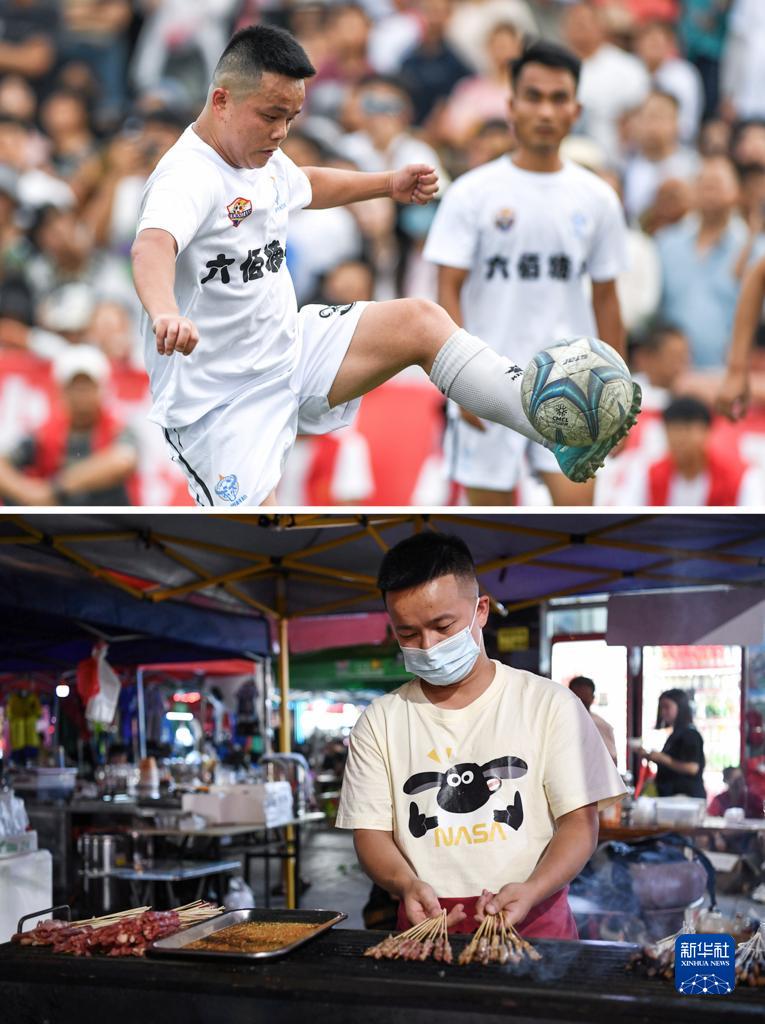 拼版照片:上圖為7月15日,六佰塘村足球隊球員楊宗維(左)在比賽中停球;下圖為7月16日,楊宗維在燒烤攤給客人烤肉串。楊宗維是一名廚師兼燒烤攤老板,他在球隊里任后腰。