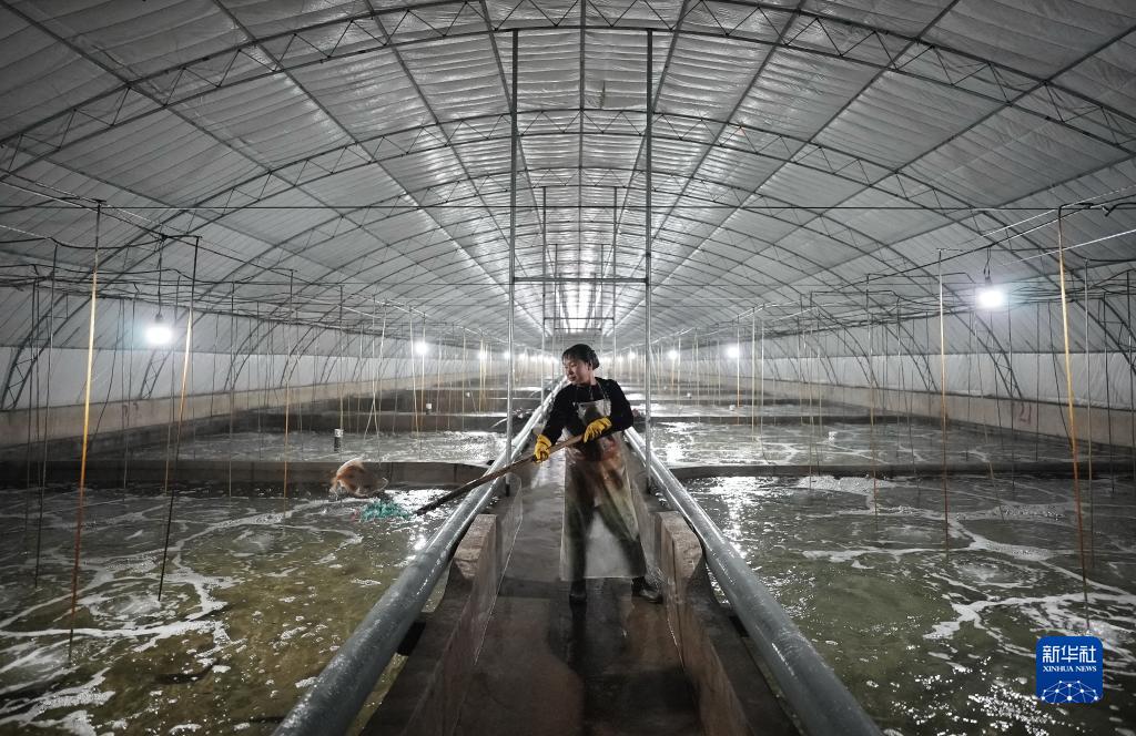 7月17日,河北省樂(lè )亭縣姜各莊鎮黃灣村村民在海產(chǎn)品工廠(chǎng)化養殖大棚內管護大菱鲆魚(yú)。