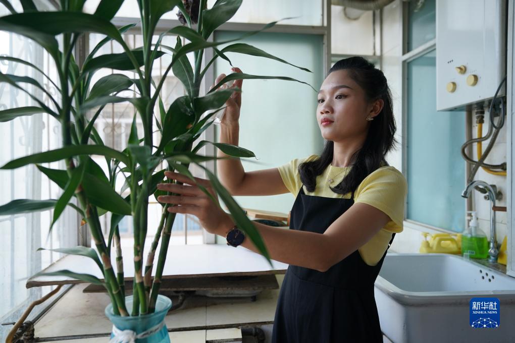 依波逢在位于昆明的住處打理綠植(7月15日攝)。