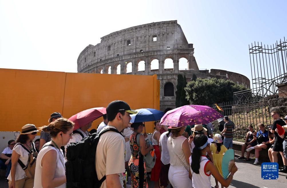 7月18日,游客在意大利羅馬斗獸場(chǎng)外游覽。