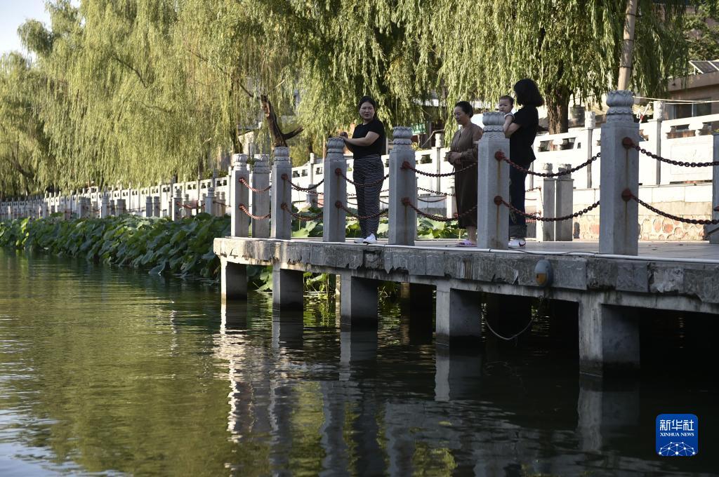 7月18日,市民在許昌市護城河邊賞荷納涼。