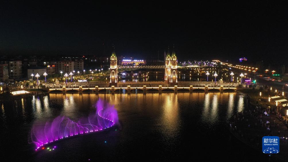 夜幕降臨,在新疆阿勒泰地區布爾津縣七彩河畔,3D全息投影技術(shù)水幕全息燈光秀表演吸引大批游客駐足觀(guān)看。
