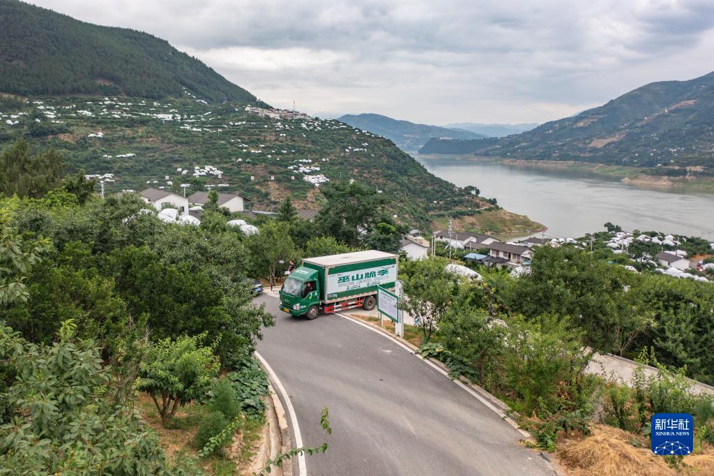 6月28日,在重慶市巫山縣曲尺鄉柑園村,裝載有巫山脆李的中國郵政物流車(chē)行駛在村內(無(wú)人機照片)。