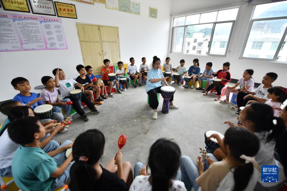 7月18日,在柳州市融安縣泗頂鎮中心小學(xué),大學(xué)生在音樂(lè )課堂上給小學(xué)生上課。