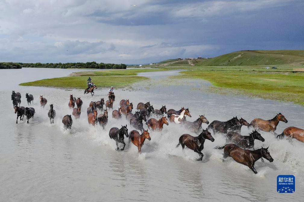 這是7月17日在新疆伊犁哈薩克自治州昭蘇縣濕地公園景區拍攝的“天馬浴河”景觀(guān)(無(wú)人機照片)。