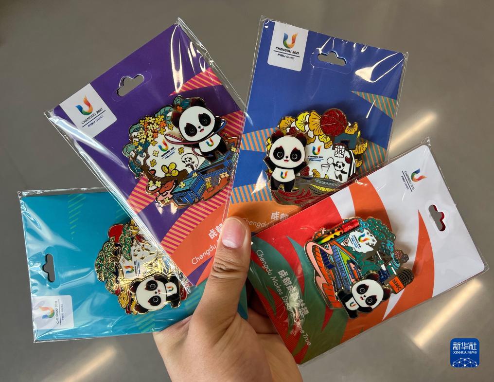 一位記者展示購買(mǎi)的成都大運會(huì )紀念章(7月16日攝)。