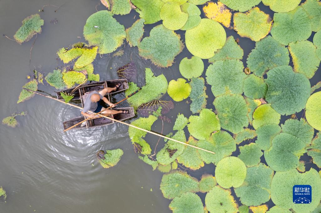7月19日,在南縣麻河口鎮曹家鋪村,村民在采收芡實(shí)和芡實(shí)根莖(無(wú)人機照片)。