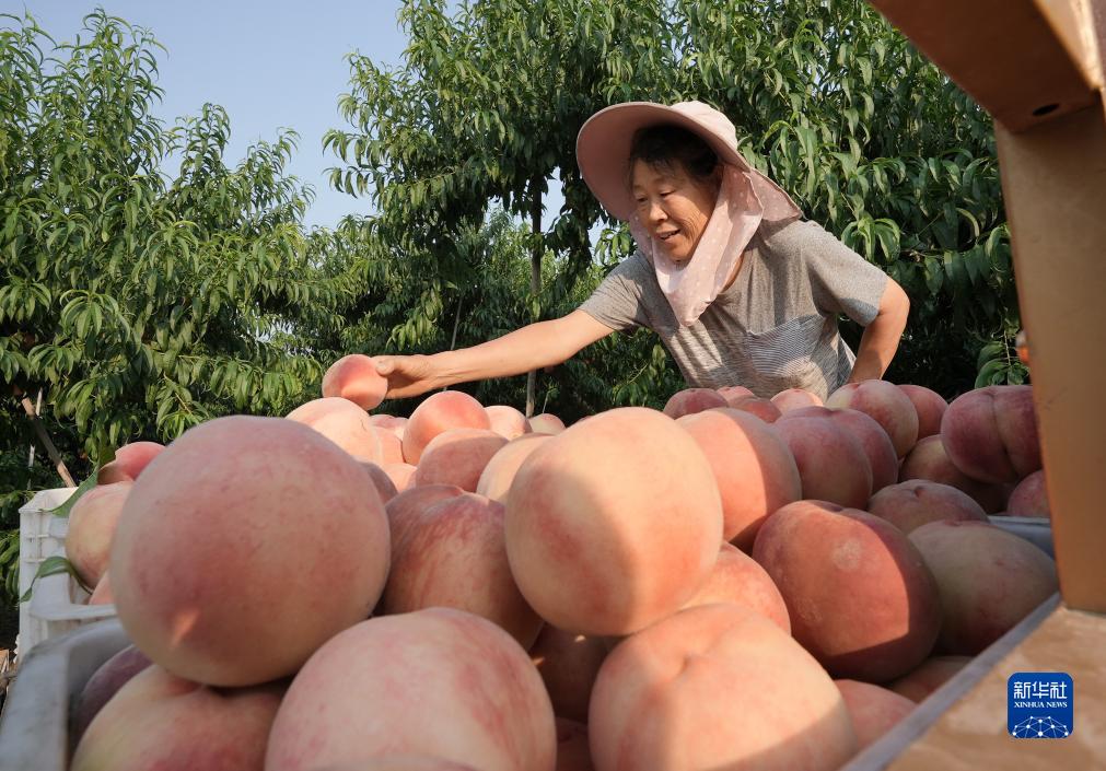 7月19日,河北省樂(lè )亭縣中堡鎮井兒坨村的一名果農在將采摘的鮮桃裝車(chē)。
