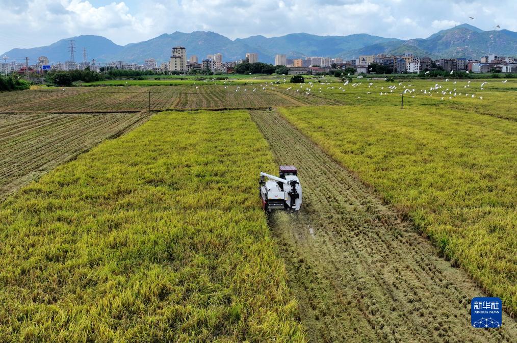 在福建省福州市長(cháng)樂(lè )區古槐鎮洋下村春欽農業(yè)專(zhuān)業(yè)合作社稻田,農民駕駛農機收割早稻(7月19日攝,無(wú)人機照片)。