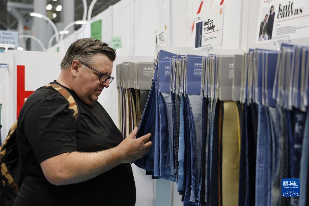 7月19日,在美國紐約舉辦的第24屆中國紡織品服裝貿易展覽會(huì )上,客商在一家中國江陰的企業(yè)展位選看面料。