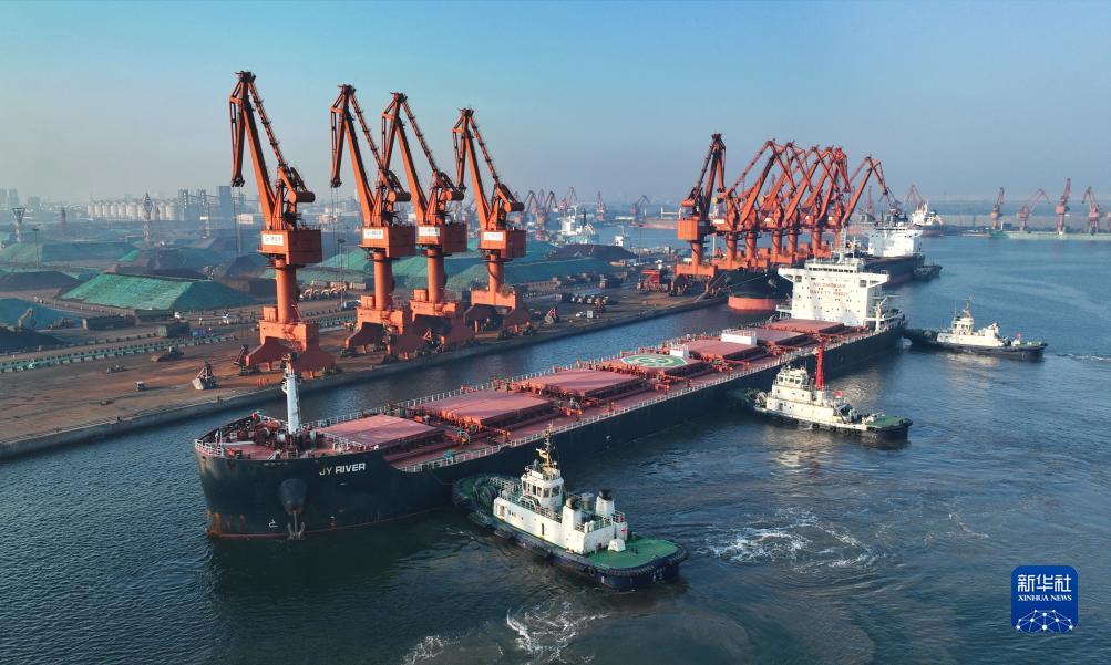 7月19日,一艘輪船在拖輪協(xié)助下向唐山港京唐港區散貨碼頭靠泊(無(wú)人機照片)。