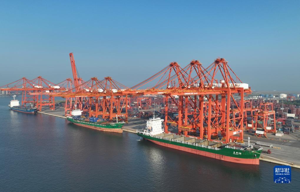 7月19日,三艘輪船靠泊在唐山港京唐港區集裝箱碼頭裝貨(無(wú)人機照片)。