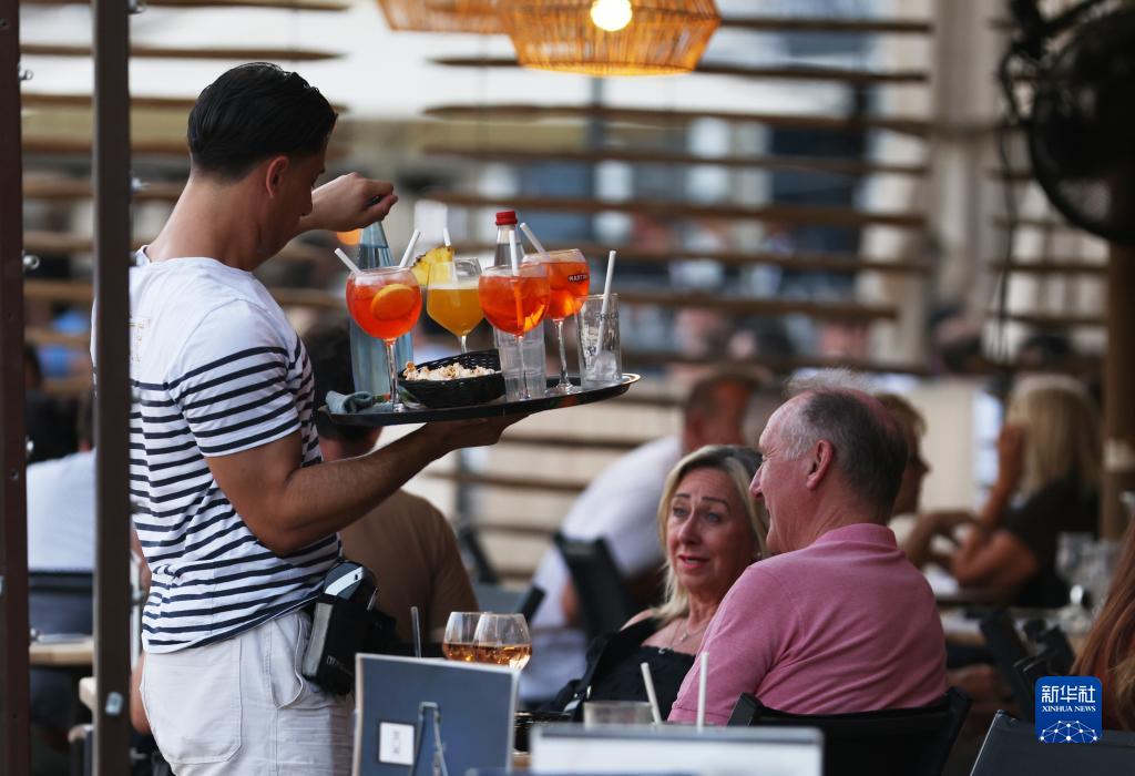 7月18日,在法國南部城市蒙彼利埃一家餐館,服務(wù)員為顧客上冰飲。