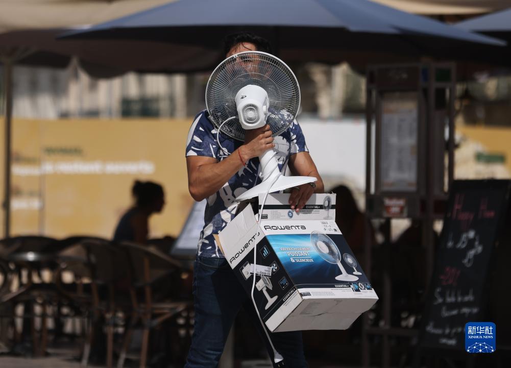 7月19日,一名男子搬著(zhù)電風(fēng)扇走在法國南部城市蒙彼利埃街頭。