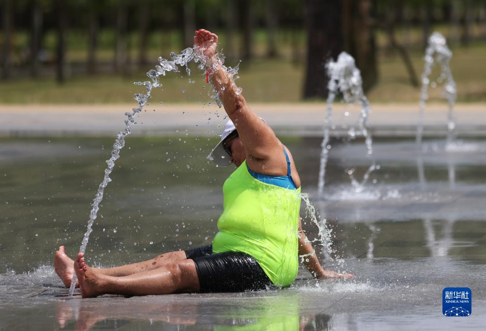 7月18日,在法國南部城市蒙彼利埃,一名女子在噴泉處消暑降溫。