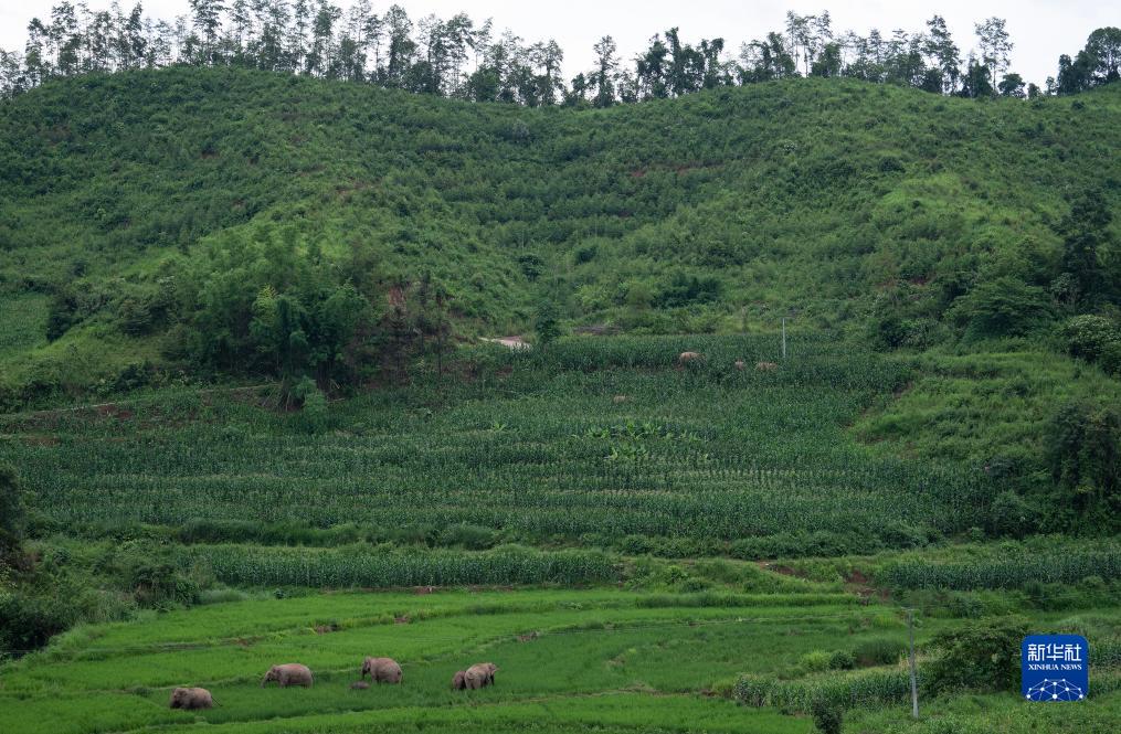 7月19日,一群亞洲象在稻田和玉米地中“大快朵頤”。