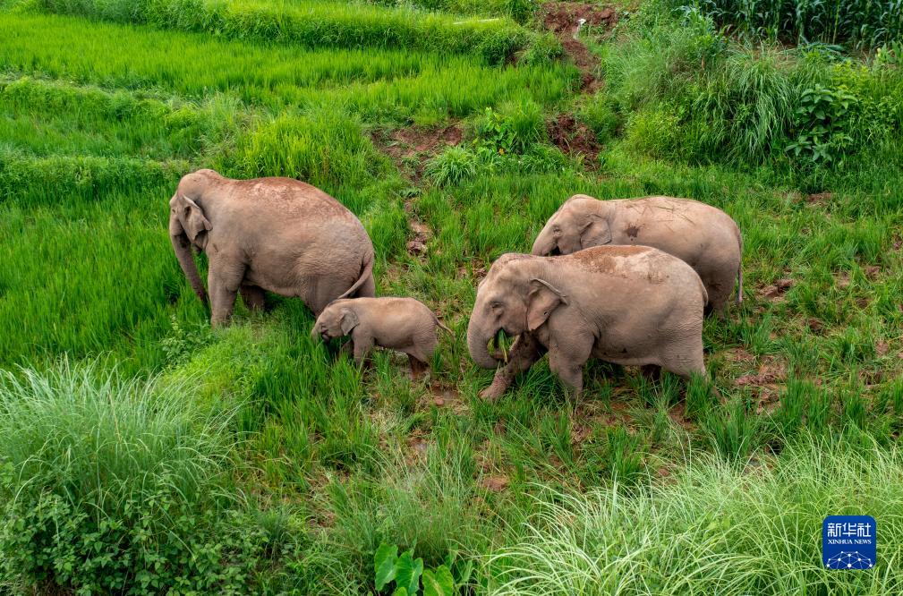 7月19日,四頭野生亞洲象在普洱市江城縣一處稻田里覓食(無(wú)人機照片)。