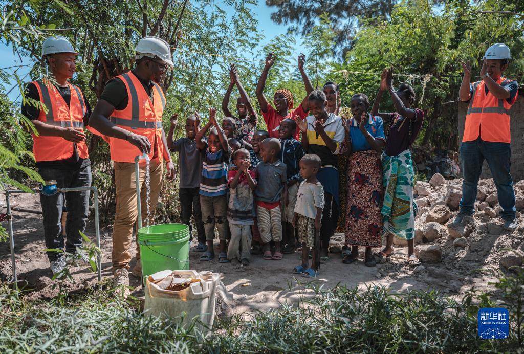 6月13日,在坦桑尼亞姆萬(wàn)扎省米松圭,凱爾文(左二)與同事接通水管后贏(yíng)得當地居民鼓掌歡呼。