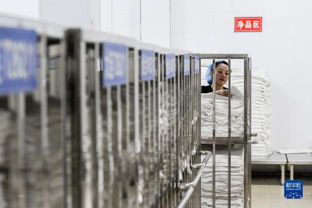 在牡丹江客運段牡(牡丹江)整備車(chē)間,洗滌二班班組長(cháng)李濱在整理干凈整潔的臥具備品(7月19日攝)。