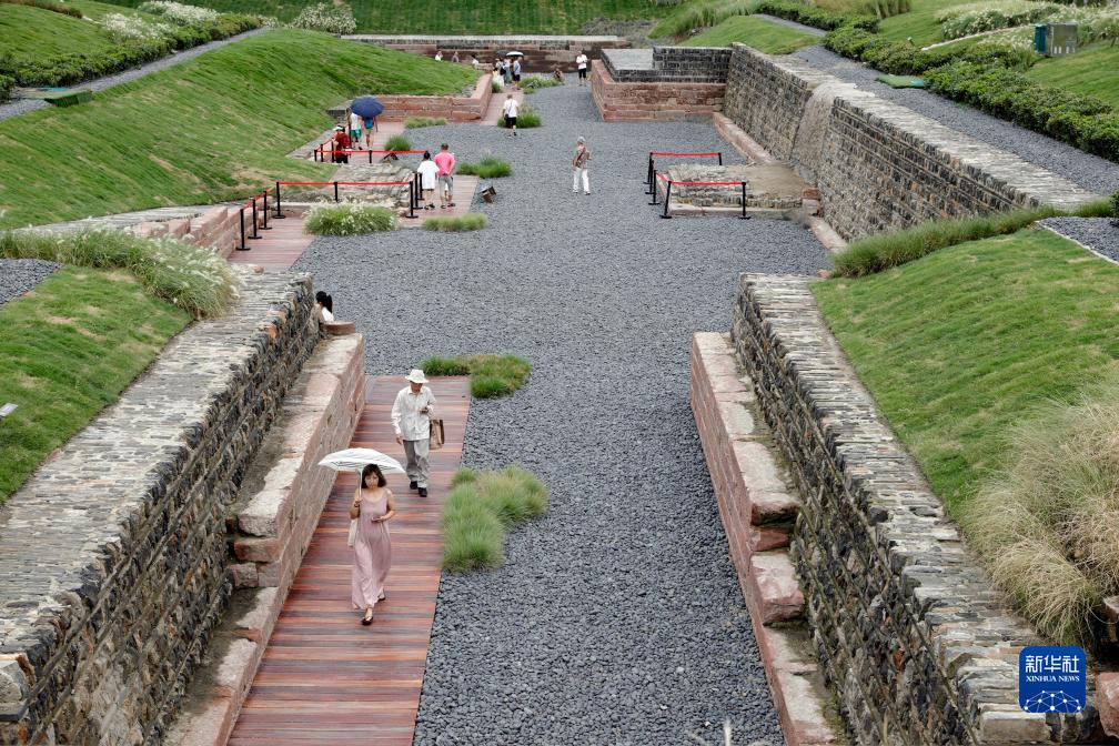 7月20日,在成都東華門(mén)遺址公園外場(chǎng)遺址區,人們在參觀(guān)原狀展示的明代蜀王府水道遺跡。