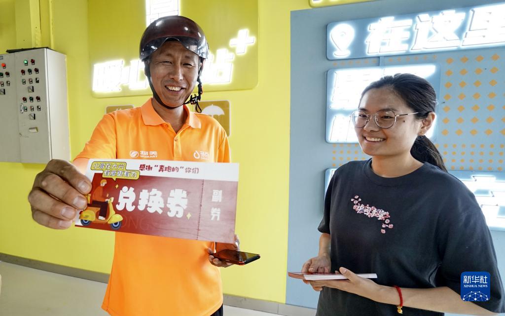 7月19日,在北京市大興區天宮院街道,一名超市配送員從工作人員處領(lǐng)取“小哥銀行”服務(wù)兌換券,可以?xún)稉Q理發(fā)、日用品、餐飲等服務(wù)。