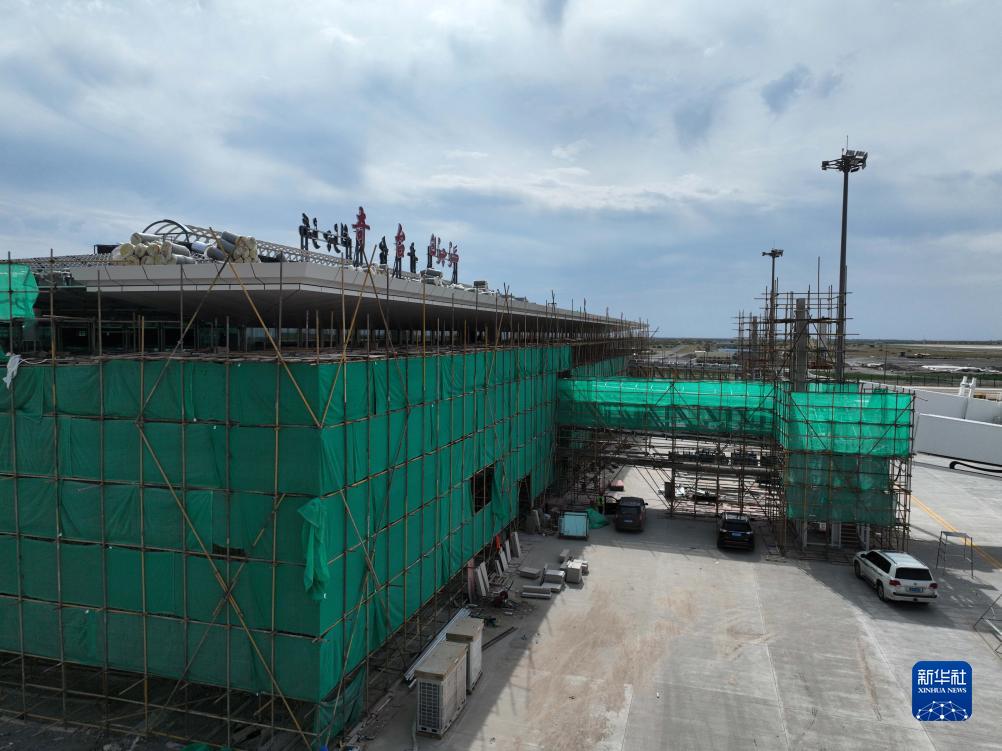 這是正在進(jìn)行外立面裝飾施工的新疆奇臺江布拉克機場(chǎng)航站樓(7月20日攝,無(wú)人機照片)。