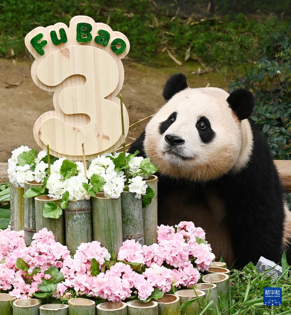 當日,在韓國出生的大熊貓“福寶”迎來(lái)3歲生日,園區制作了由竹子和胡蘿卜組成的“蛋糕”為其慶生。