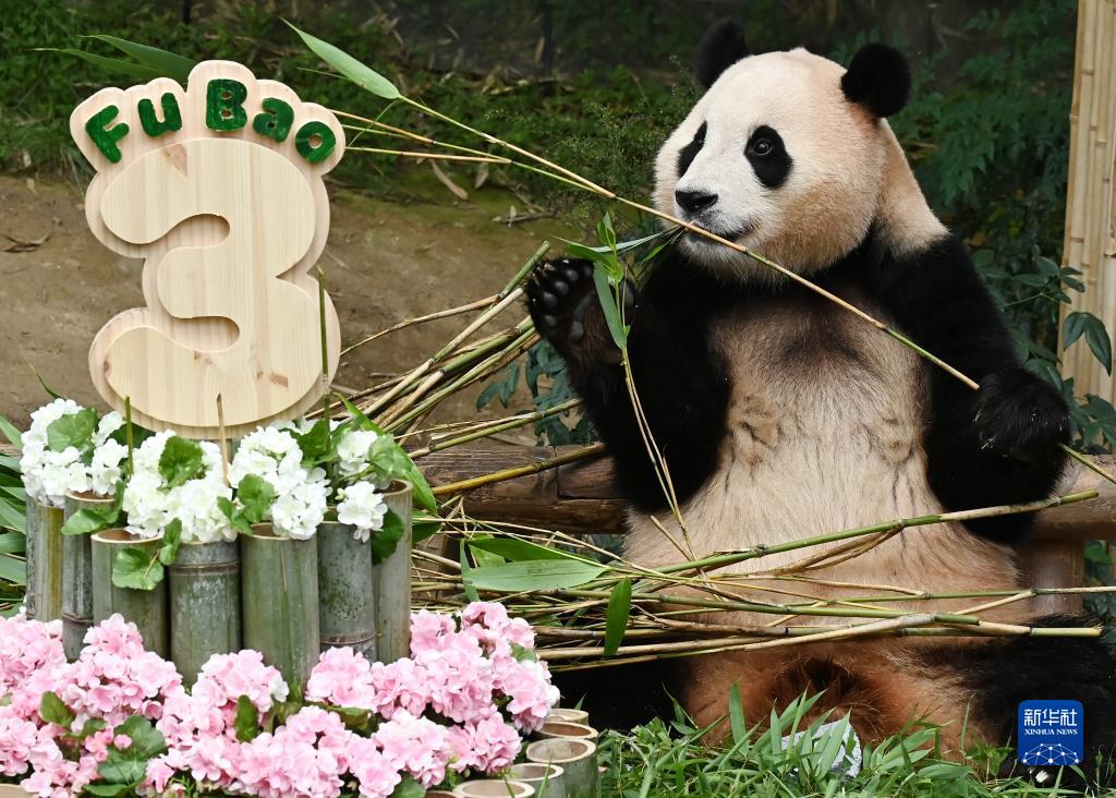 當日,在韓國出生的大熊貓“福寶”迎來(lái)3歲生日,園區制作了由竹子和胡蘿卜組成的“蛋糕”為其慶生。