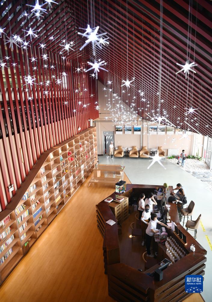 7月20日,工作人員在沙漠圖書(shū)館大廳給游客辦理借書(shū)。
