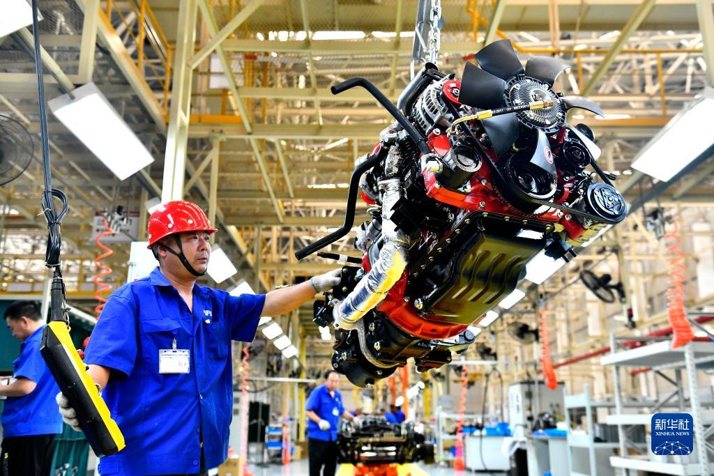 7月21日,在位于威海市文登區的濰柴新能源商用車(chē)有限公司,工人在生產(chǎn)線(xiàn)上吊裝發(fā)動(dòng)機。