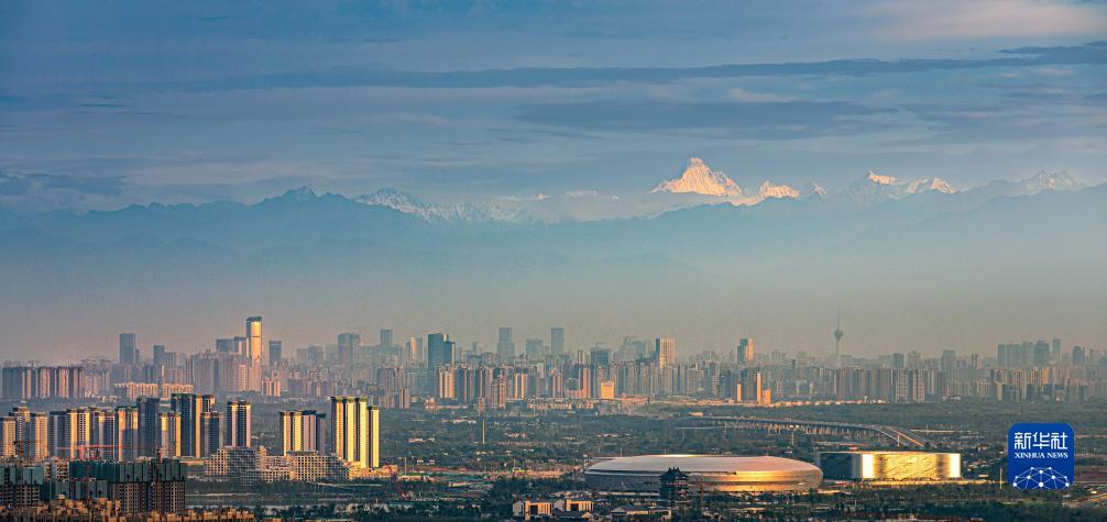這是成都市區建筑和遠處的雪山(2021年6月4日攝)。