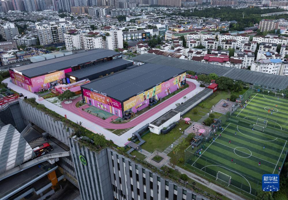 這是成都市金沙天空森林體育公園(7月20日攝)。金沙天空森林體育公園位于成都市金沙公交樞紐站停車(chē)場(chǎng)樓頂,占地12000平方米,有籃球館、排球館、綜合訓練館、體適能訓練區、足球場(chǎng)和健身步道等。