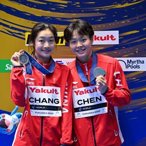 當日,在日本福岡舉行的2023年世界游泳錦標賽跳水女子單人三米板決賽中,中國選手陳藝文、昌雅妮分別以359.50分和341.50分的成績(jì)包攬冠亞軍。