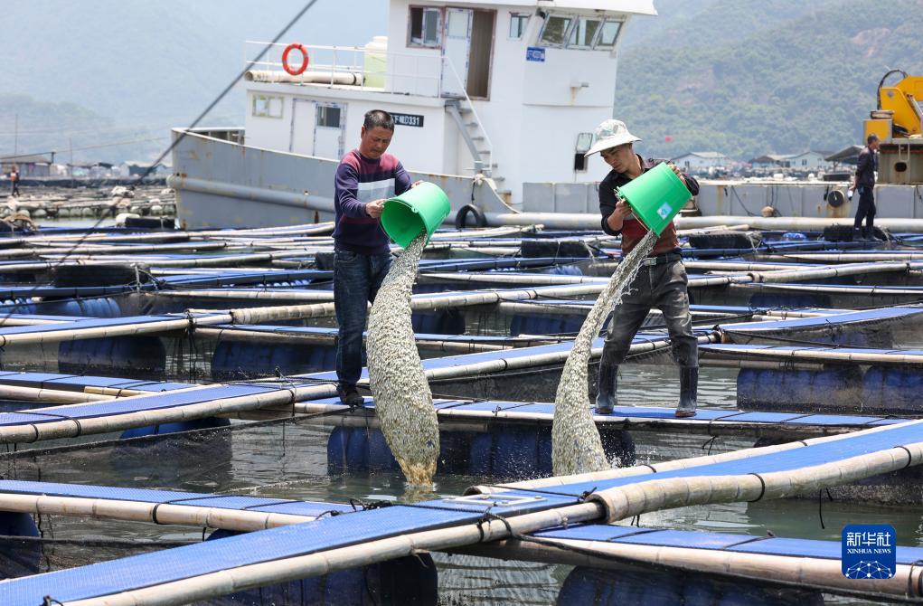 養殖戶(hù)在寧德三都澳東沖口海域投放大黃魚(yú)魚(yú)苗(5月9日攝)。